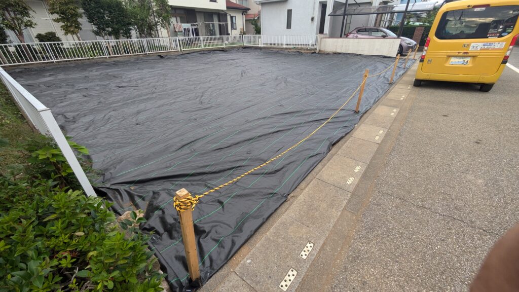 まず、長期タイプの顆粒除草剤を念入りに撒いてからシートを施工します。昨日はソコソコ風があったので1人だとちょっと大変でしたが、まぁまぁ綺麗に施工完了です♪