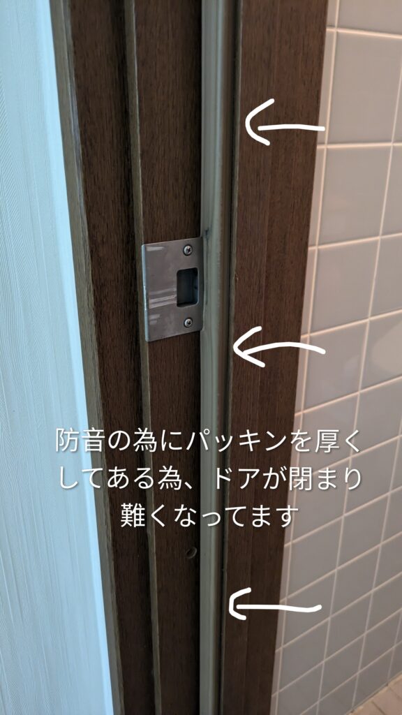 休憩室直結のトイレなので、防音対策にドアモールが分厚く追加されてて、力を入れないと閉まらないようになってました。