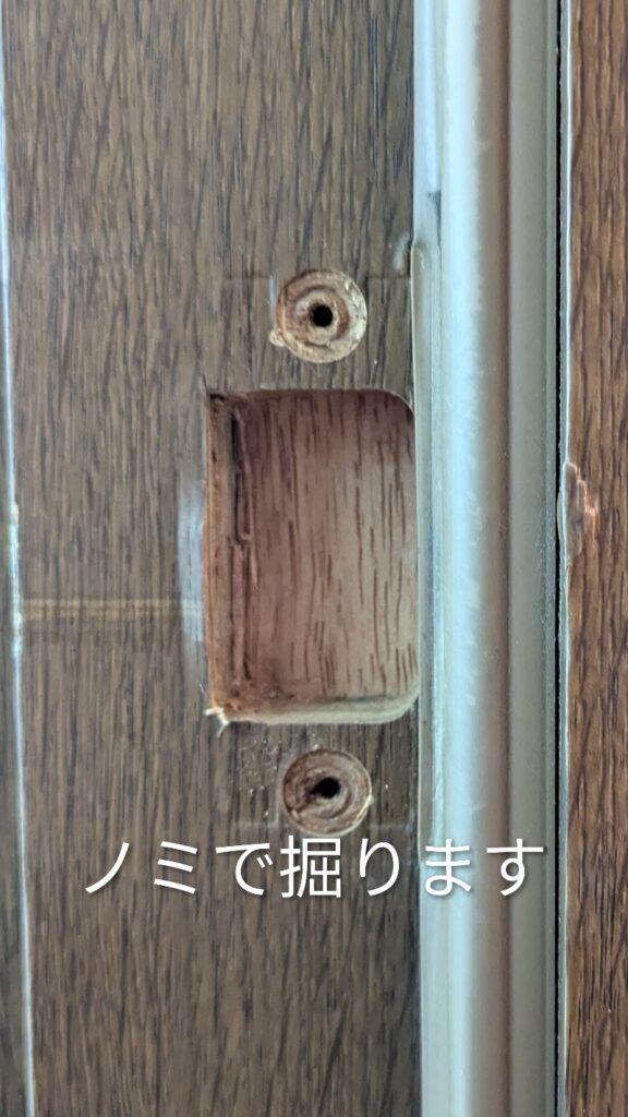 受け穴はノミでさくって、ネジ穴は秒でカチカチに固まる穴埋めで埋めます。