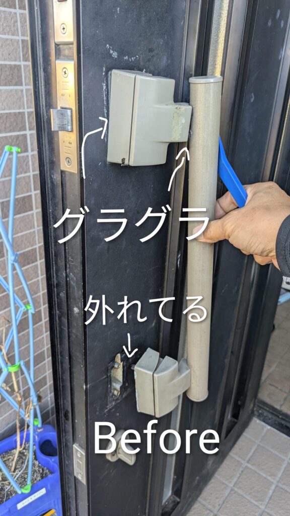 ②新規のお客様玄関ドアのドアノブのネジが緩んでいるのと外れているのとで風前の灯火で…