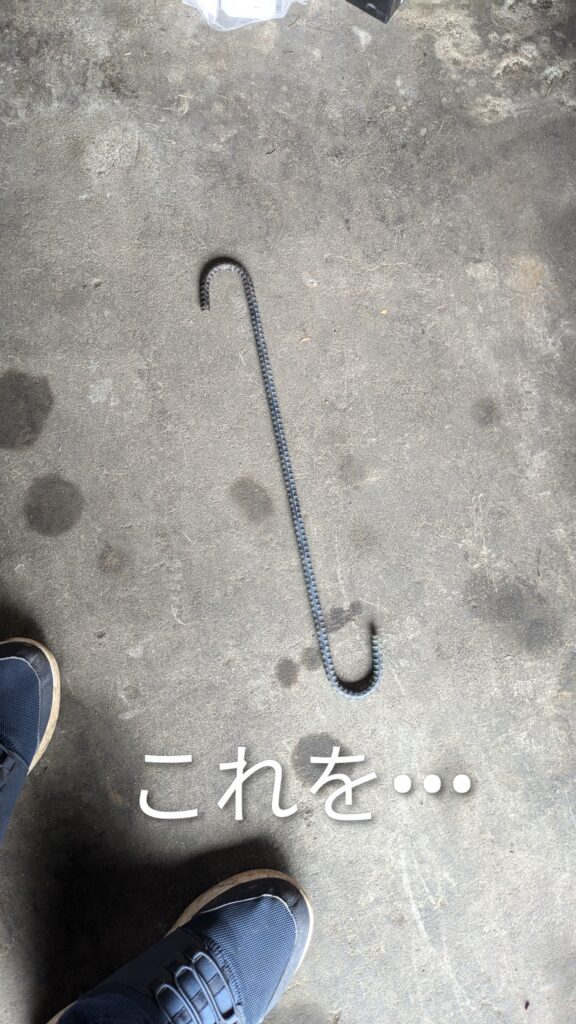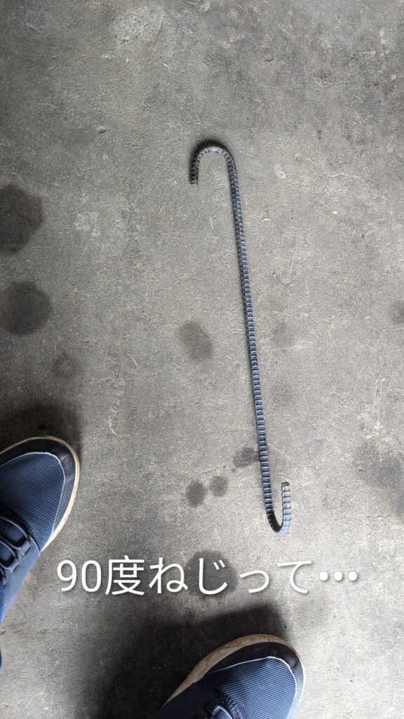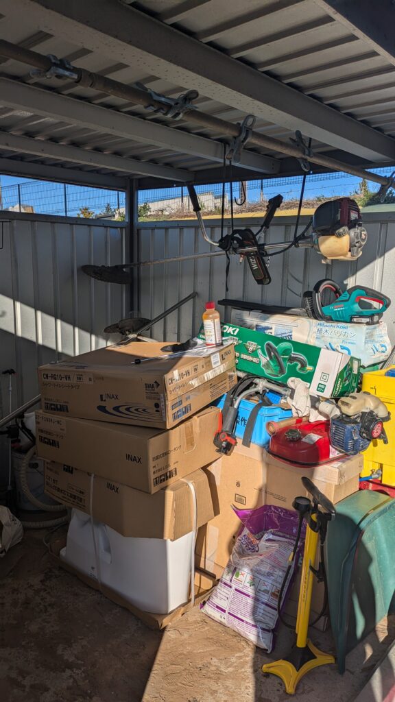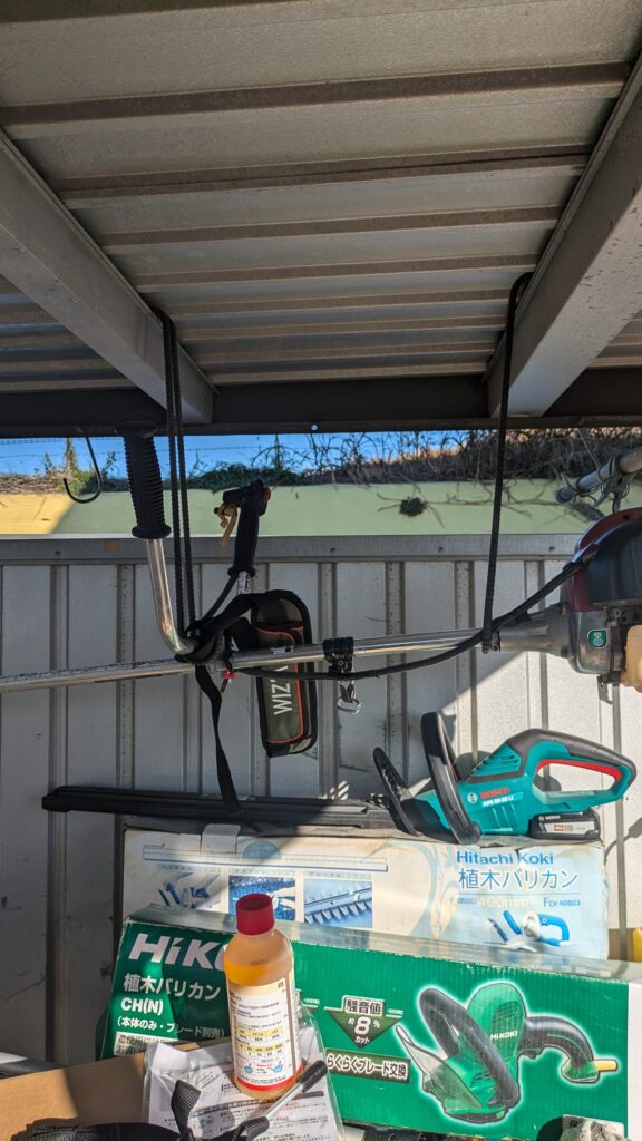 ①自宅の自転車小屋の草刈機収納フックの改良です。