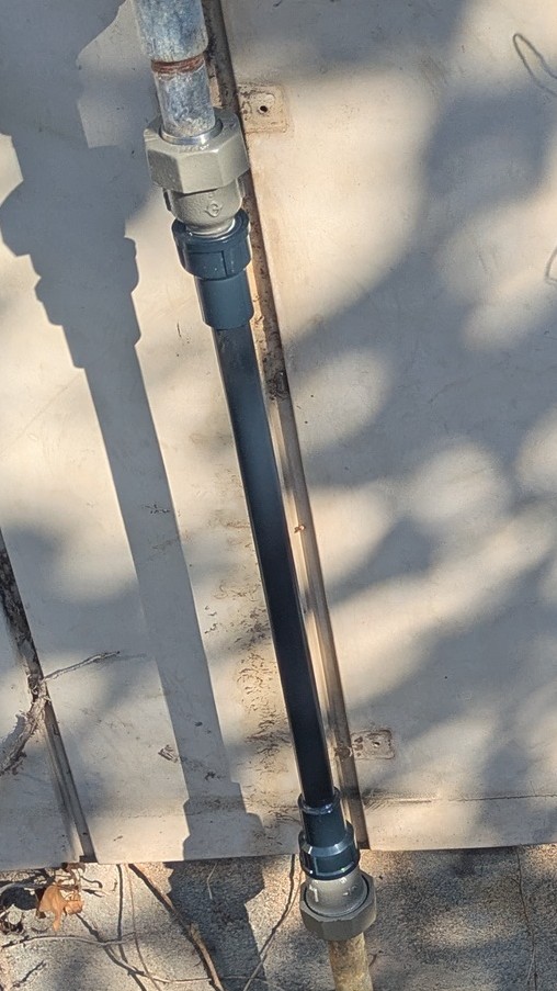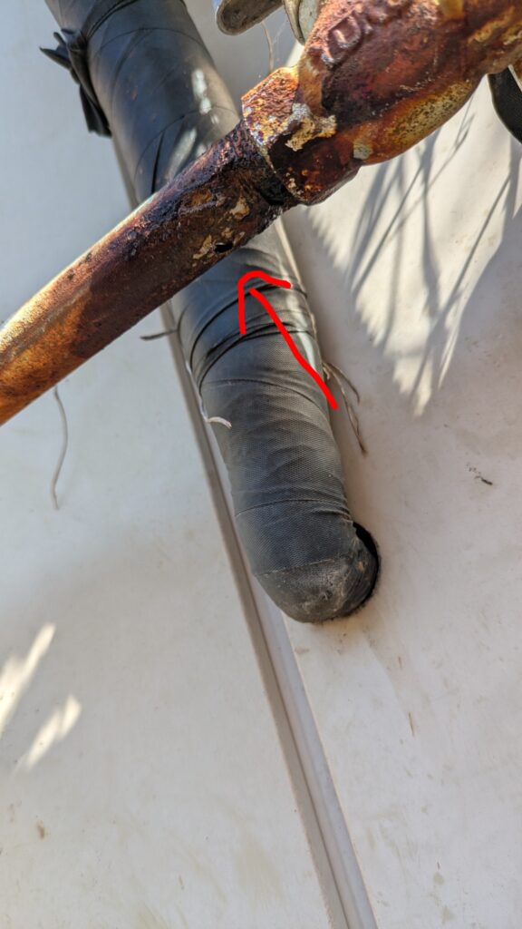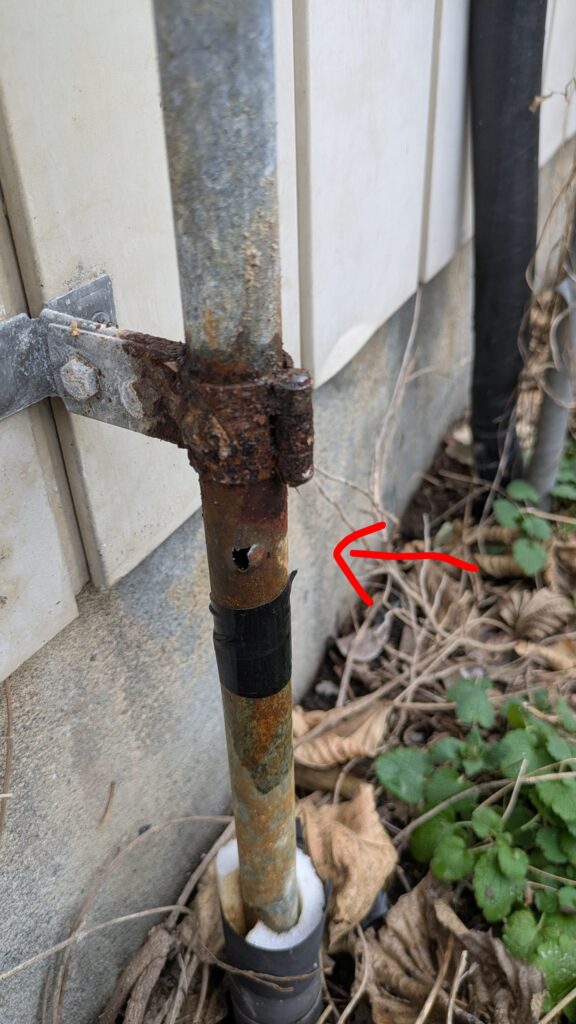 下側の穴は、塞ぐだけで済まそうとして塞いだら、上の方からもチョロチョロと漏れだしたので、仕方なく大きく切ってつなぎ直しました。
