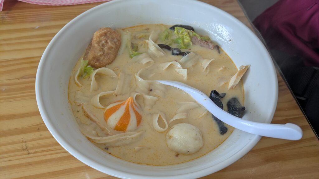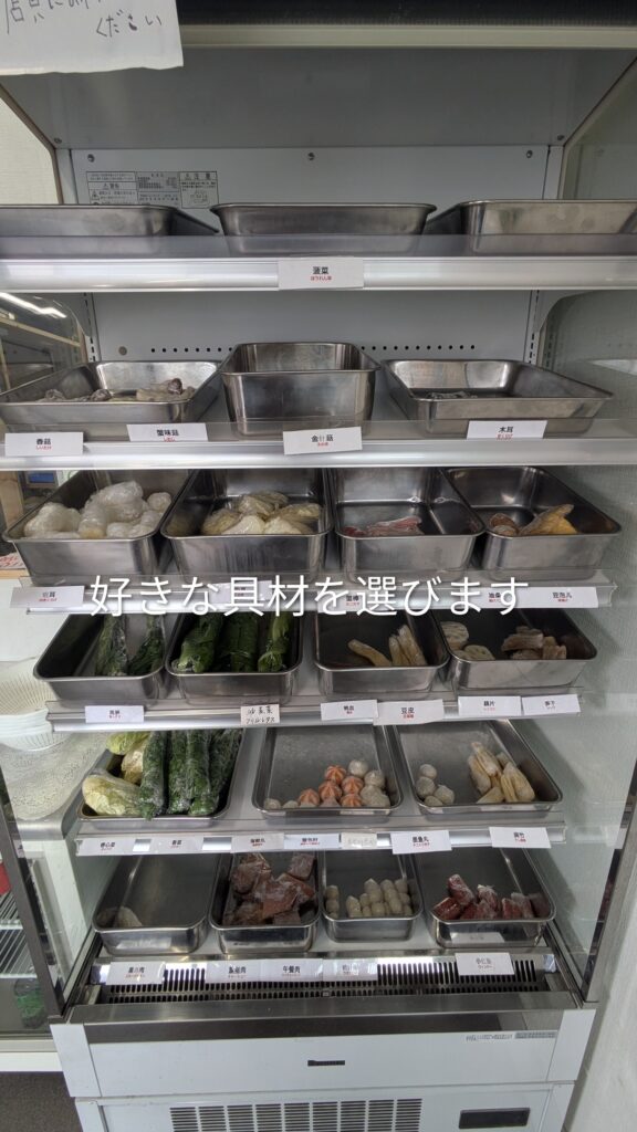 麻辣湯は3種類の麺を選んで辛さを選んで、具材を自分で棚からとって店員さんに渡して調理してもらいます。